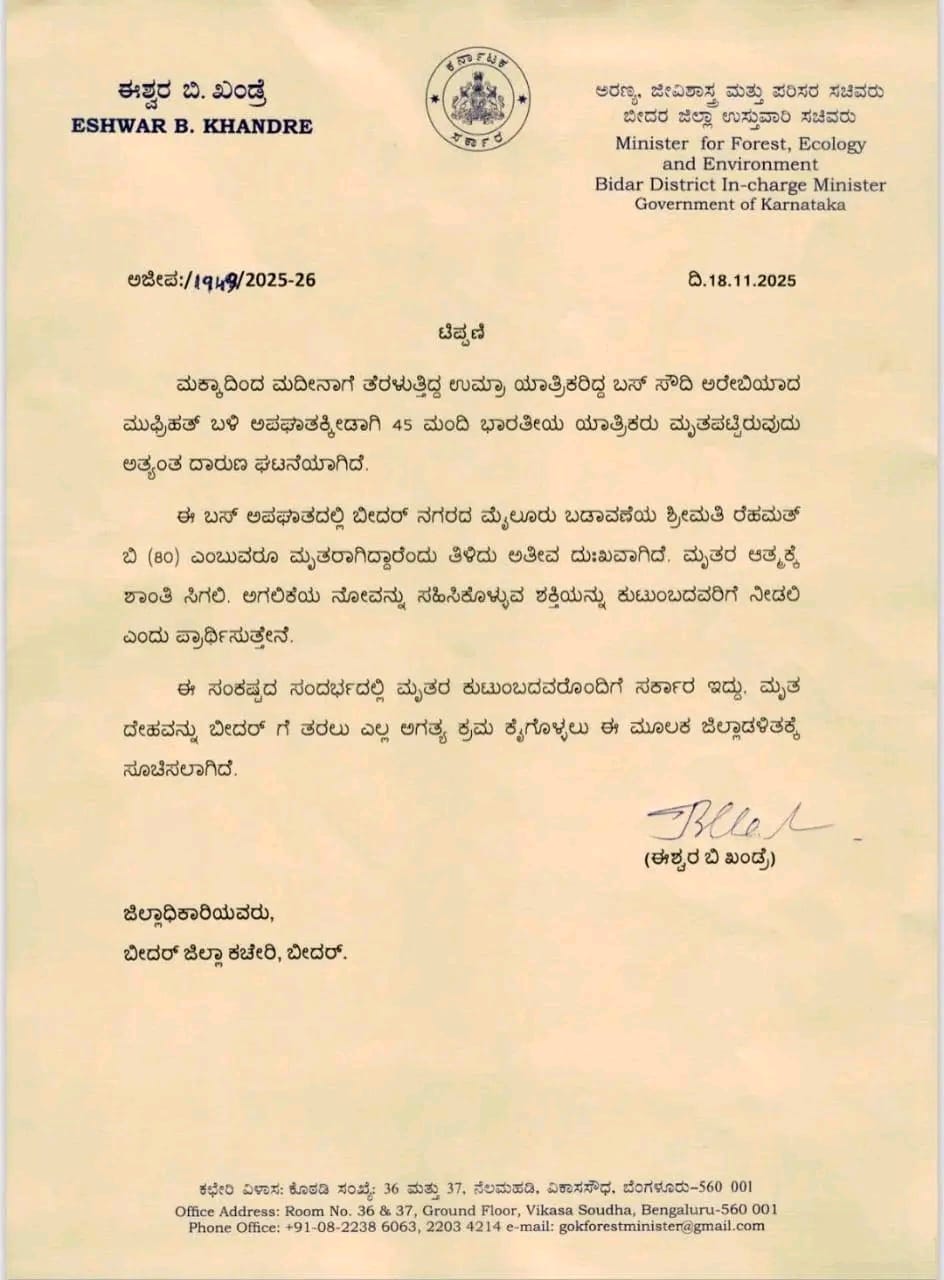 ಬೀದರ್: ಸೌದಿ ಅರೇಬಿಯಾದಲ್ಲಿ ಸೋಮವಾರ ಸಂಭವಿಸಿದ ಭೀಕರ ಬಸ್ ಅಪಘಾತದಲ್ಲಿ ಬೀದರ್ ನಗರದ ಮಹಿಳೆಯೊಬ್ಬರು ಮೃತಪಟ್ಟಿರುವುದನ್ನು ಜಿಲ್ಲಾಡಳಿತ ಮಂಗಳವಾರ ದೃಢಪಡಿಸಿದೆ. ನಗರದ ಮೈಲೂರಿನ ಸಿಎಂಸಿ ಕಾಲೊನಿಯ ನಿವಾಸಿ ರಹಮತ್ ಬೀ (80) ದುರ್ದೈವಿಯಾಗಿದ್ದಾರೆ.