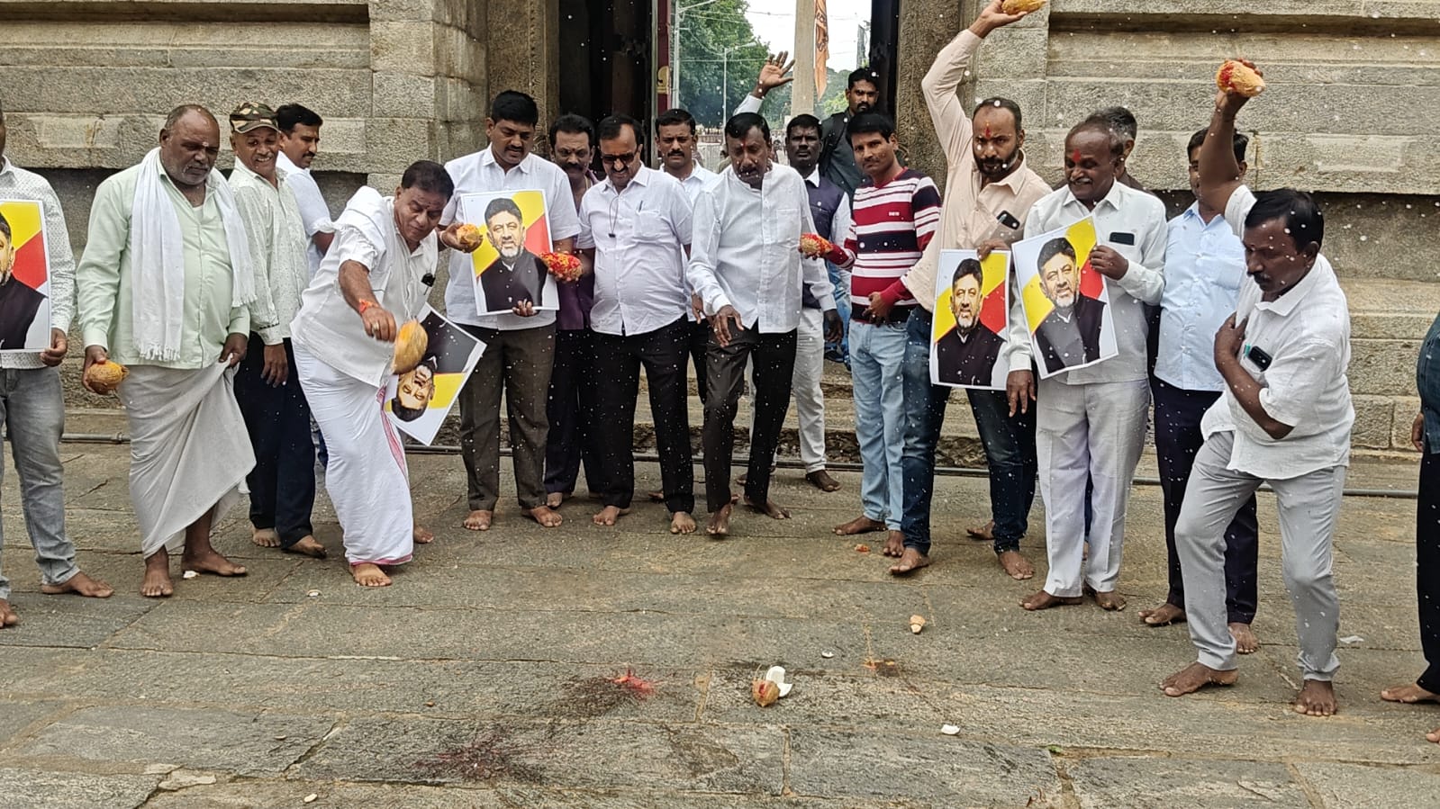 ಶ್ರೀ ಚಾಮರಾಜೇಶ್ವರ ದೇವಸ್ಥಾನಕ್ಕೆ ಆಗಮಿಸಿದ್ದ ಬೆಂಬಲಿಗರು ಡಿ.ಕೆ. ಶಿವಕುಮಾರ್ ರವರ ಭಾವಚಿತ್ರ ಹಿಡಿದು ವಿಶೇಷ ಪೂಜೆ ಸಲ್ಲಿಸಿದ್ದು, ನಂತರ ದೇವಾಲಯದ ಹೊರಾಂಗಣದಲ್ಲಿ ಇಡುಗಾಯಿ ಹೊಡೆದು ರಾಜಕೀಯ ಯಶಸ್ಸಿಗಾಗಿ ದೇವರಲ್ಲಿ ಪ್ರಾರ್ಥಿಸಿದರು. ಮಾಧ್ಯಮದವರೊಂದಿಗೆ ಮಾತನಾಡಿದ ಒಕ್ಕಲಿಗ ಮುಖಂಡ ಚಾ.ರಂ. ಶ್ರೀನಿವಾಸಗೌಡ ಅವರು, “ಡಿ.ಕೆ. ಶಿವಕುಮಾರ್ ತಕ್ಷಣ ಮುಖ್ಯಮಂತ್ರಿಯಾಗಲೆಂದು ದೇವರಲ್ಲಿ ಪ್ರಾರ್ಥಿಸಿದ್ದೇವೆ. ಪೂಜೆ ಮತ್ತು ಇಡುಗಾಯಿ ಮೂಲಕ ನಮ್ಮ ಸಂಕಲ್ಪ ವ್ಯಕ್ತಪಡಿಸಿದ್ದೇವೆ ,” ಎಂದು ತಿಳಿಸಿದರು